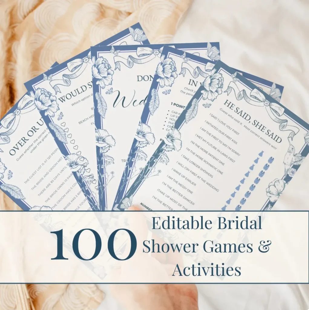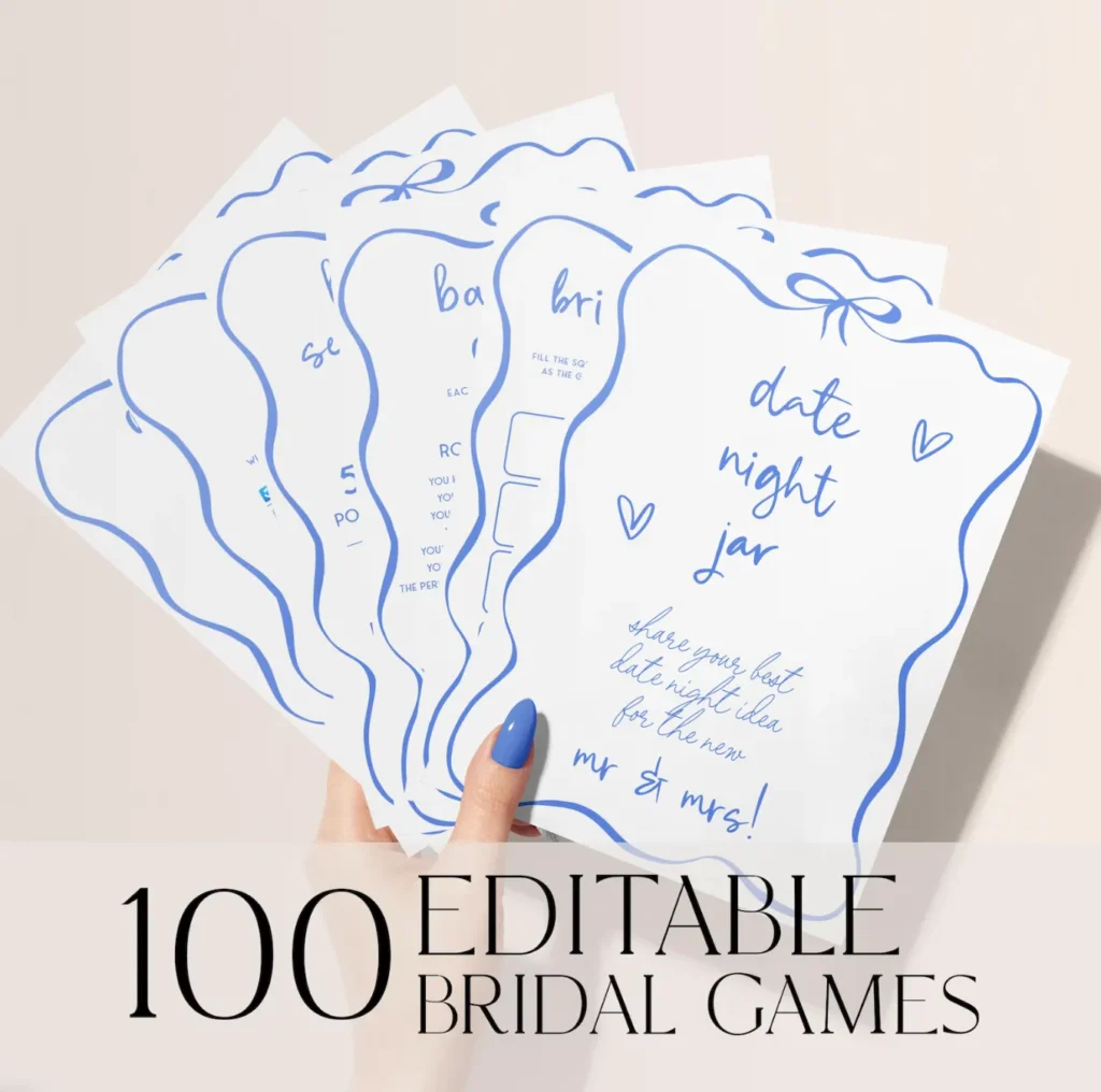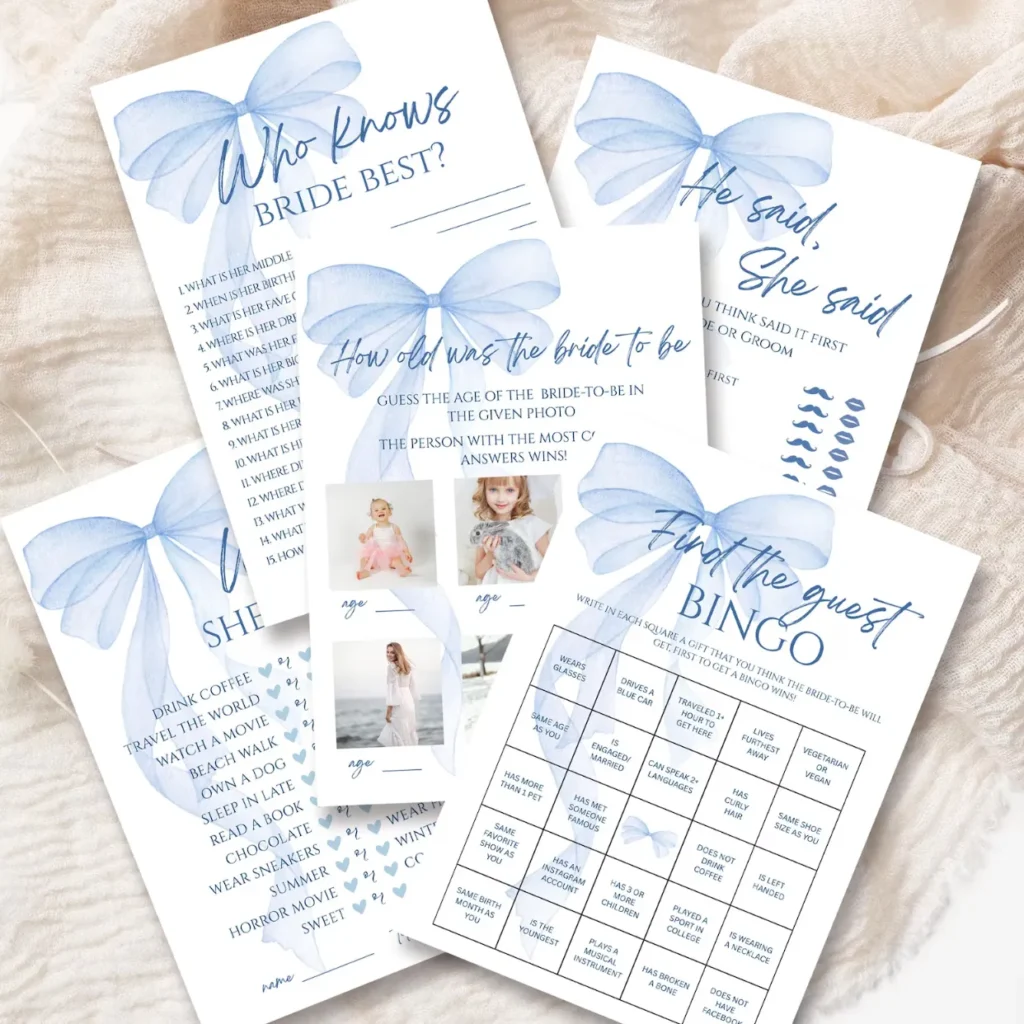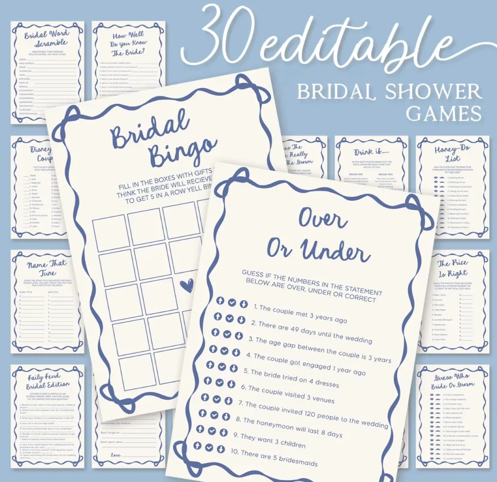 Planning a ‘Something Blue‘ bridal shower and needing some games? Then you’re in the right place! As a designer who creates bridal shower bundles for a living, I can tell you : a cohesive game set does more than fill time… it can pull the whole theme together.